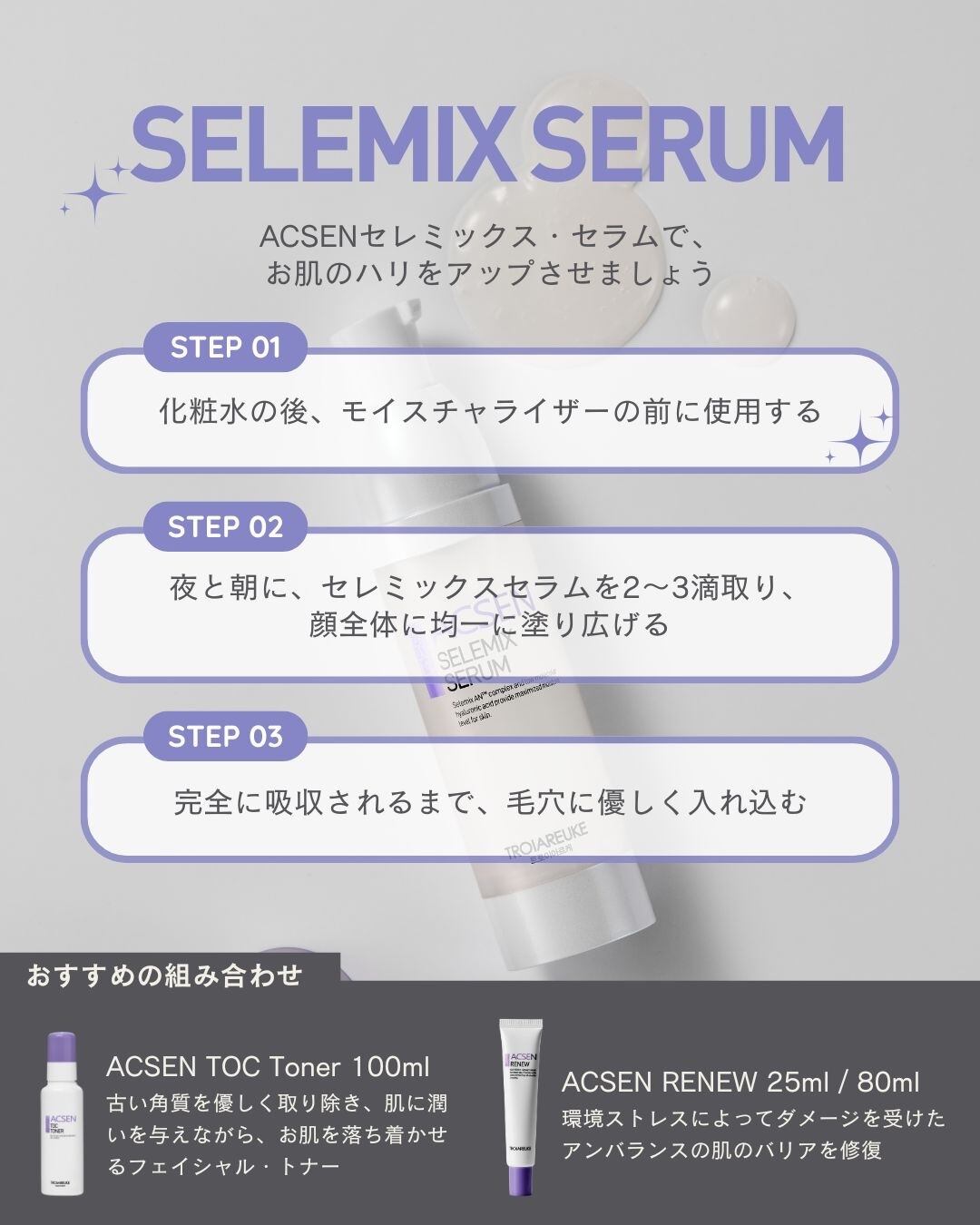 Selemix An(スキンコンディショニング、保護、鎮静、角質除去、リサーフェイシング、引き締め、セラムバランシング)、ベタイン(抗シワ)、シリカ(コラーゲンブースト)、クララエキス(スキンコンディショニング)
